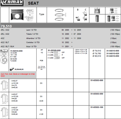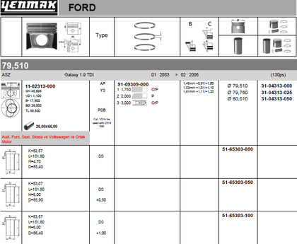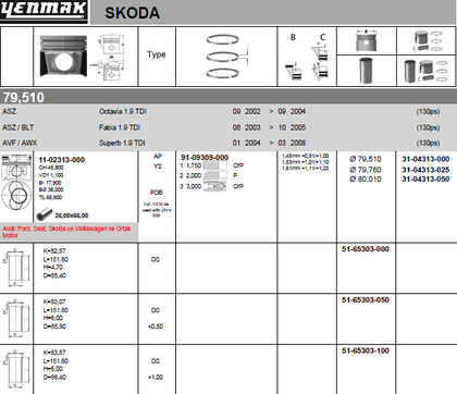 Поршень Yenmak для Audi A4 II (B6) 2000-2004. Артикул 31-04313-050