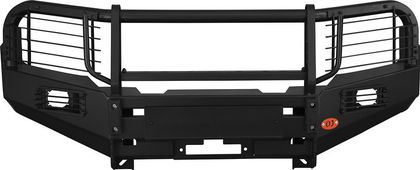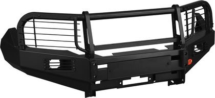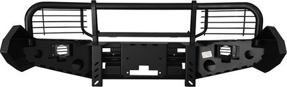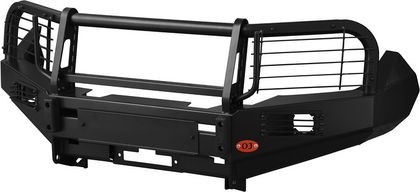Передний силовой бампер OJ серии Трофи на Nissan Navara/Pathfinder III 2010+. С защитными дугами, вертикальной площадкой лебёдки, листом защиты бампер-рама, ПТФ ОСВАР 3602.3743, защитными решётками основных и дополнительных фар, рейкой дополнительных фар, рогами для смотки троса, рамкой номерного знака, буферами резиновыми, буксирными проушинами, упорами для реечного домкрата. Данный бампер может быть укомплектован различным дополнительным оборудованием, в том числе кронштейном 08.002.01 для съёмной площадки лебёдки. Полное описание бампера, порядок его установки, технические характеристики, условия эксплуатации приведены в техпаспорте (ссылка "скачать документацию" выше).