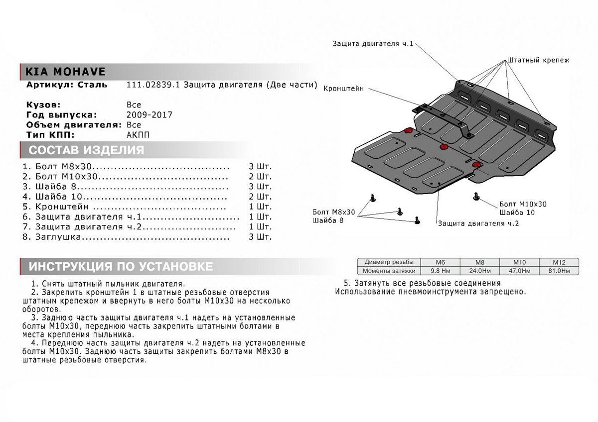 | Комплектация | защита - 1 шт., комплект крепежа, инструкция по установке, упаковка |