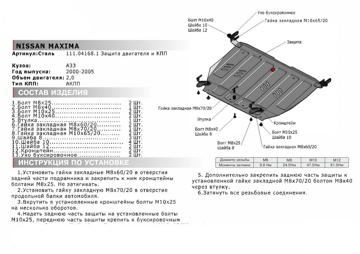 | Комплектация | защита - 1 шт., комплект крепежа, инструкция по установке, упаковка |